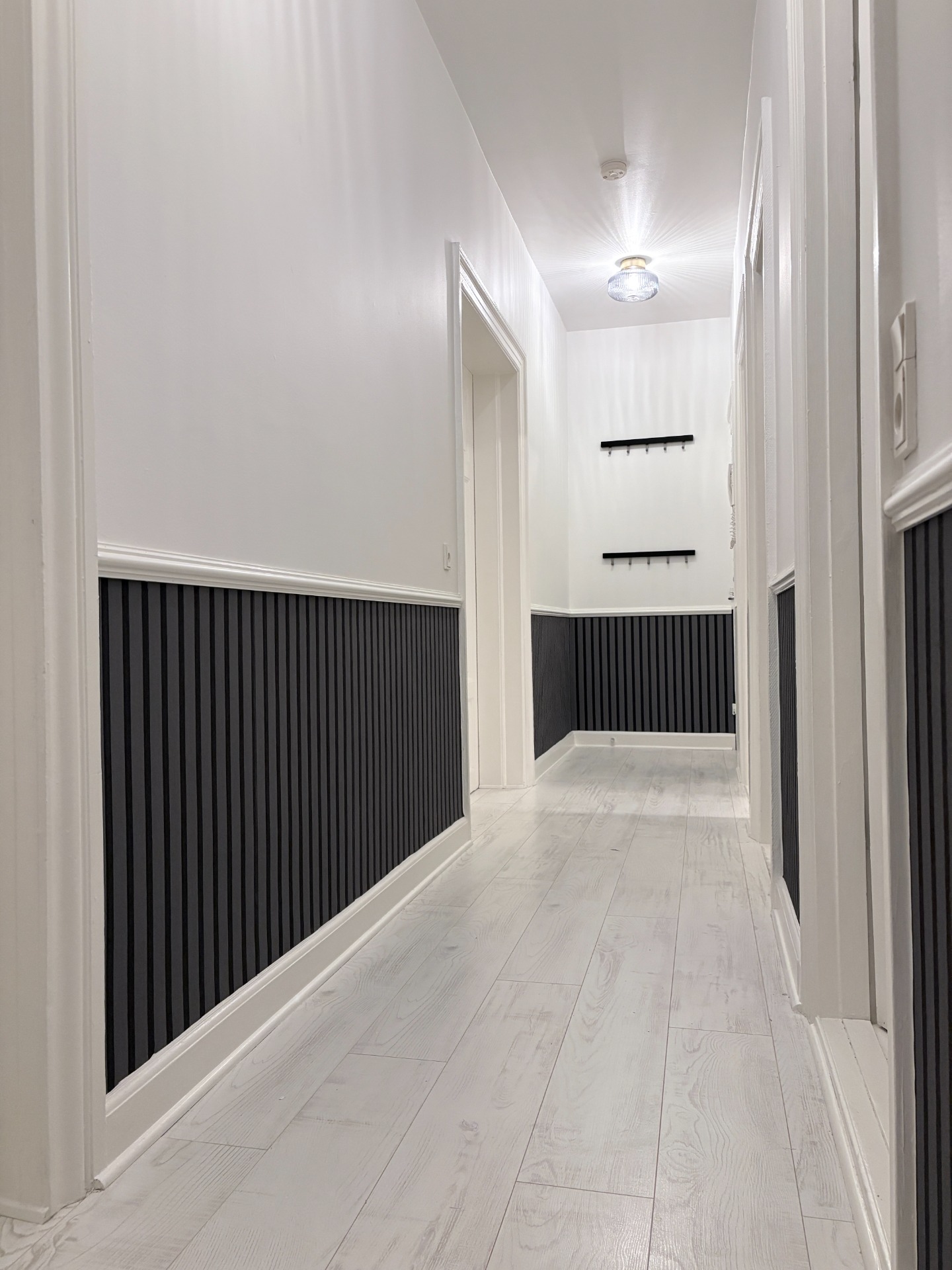 Designvægge i kombination af maling, træ og tapet